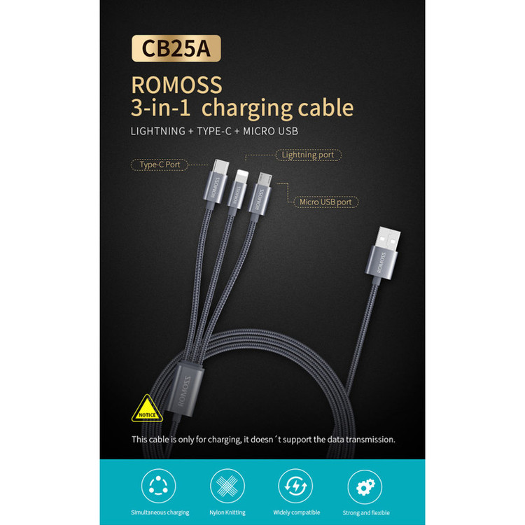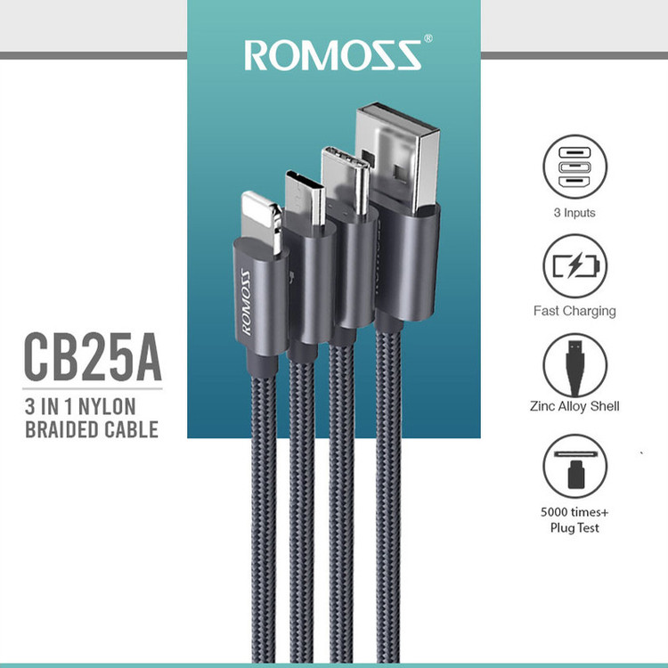 کابل روموس 3 در 1 مدل CB25A مناسب برای گوشی های موبایل با سوکت شارژ میکرو یو اس بی و لایتینگ و تیپ سی سازگار با تمامی برندهای موبایل و تبلت از جمله اپل ایفون و ایپد,سامسونگ,الجی,شیائومی,هواوی و غیره همچنین دستگاه دیگر نظیر ردیاب دوربین و پاوربانک و ساعت های هوشمند جهت شارژ و انتقال دیتا میباشد کابل CB25A قابلیت شارژ سریع و فست داشته و جنس روکش کابل از نایلون و قسمت های بالا و پایین کابل از فلز و لاستیک فشرده جهت جلوگیری از قطع شدن کابل میباشد و حتی میتواند 3 گوشی را همزمان با این کابل شارژ کرد ولی بهتر است جهت شارژ و انتقال دیتا همیشه به یک گوشی متصل باشد طول کابل یک متر بوده و مناسب برای کسانی که چندین موبایل از برندهای متفاوت با کابل شارژهای متفاوت دارند میباشد و دیگر نیازی به حمل چندین کابل نیست روموس یکی از برندهای معتبر کابل و شارژر و پاوربانک بوده و کیفیت محصولات این کمپانی با کمپانی های دیگر از لحاظ قیمت و کیفیت قابل مقایسه نیست