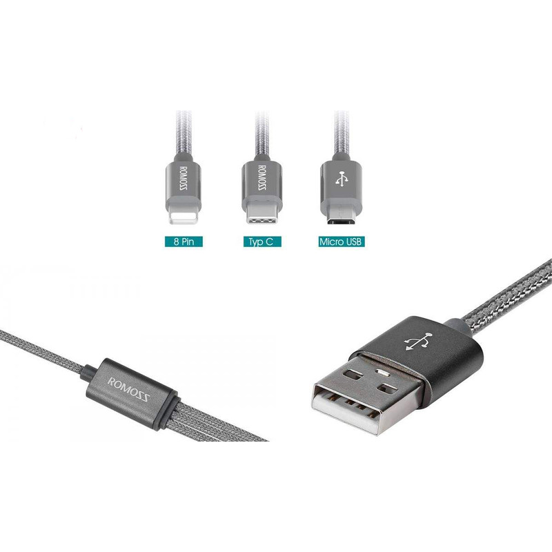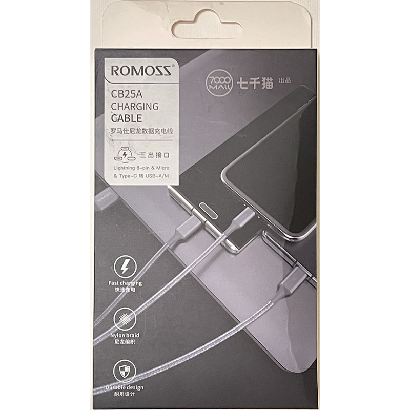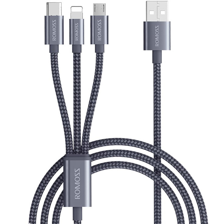 کابل روموس 3 در 1 مدل CB25A مناسب برای گوشی های موبایل با سوکت شارژ میکرو یو اس بی و لایتینگ و تیپ سی سازگار با تمامی برندهای موبایل و تبلت از جمله اپل ایفون و ایپد,سامسونگ,الجی,شیائومی,هواوی و غیره همچنین دستگاه دیگر نظیر ردیاب دوربین و پاوربانک و ساعت های هوشمند جهت شارژ و انتقال دیتا میباشد کابل CB25A قابلیت شارژ سریع و فست داشته و جنس روکش کابل از نایلون و قسمت های بالا و پایین کابل از فلز و لاستیک فشرده جهت جلوگیری از قطع شدن کابل میباشد و حتی میتواند 3 گوشی را همزمان با این کابل شارژ کرد ولی بهتر است جهت شارژ و انتقال دیتا همیشه به یک گوشی متصل باشد طول کابل یک متر بوده و مناسب برای کسانی که چندین موبایل از برندهای متفاوت با کابل شارژهای متفاوت دارند میباشد و دیگر نیازی به حمل چندین کابل نیست روموس یکی از برندهای معتبر کابل و شارژر و پاوربانک بوده و کیفیت محصولات این کمپانی با کمپانی های دیگر از لحاظ قیمت و کیفیت قابل مقایسه نیست