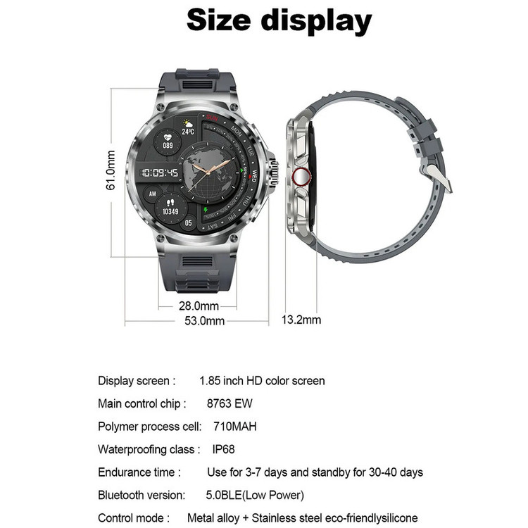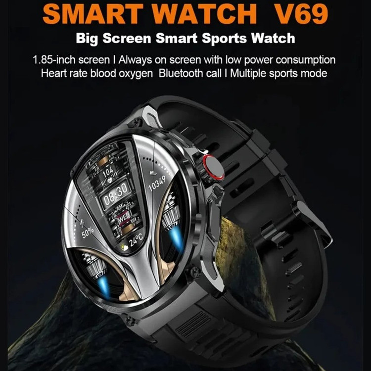 ساعت هوشمند V69 دارای صفحه نمایش 1.85 اینچی است که یکی از بزرگترین صفحات نمایش در بین ساعتهای هوشمند با طراحی اسپرت و گرد را دارد. صفحه نمایش این ساعت دارای رزولوشن 360x360 اچ دی فول تاچ است. استفاده از دکمه جوی استیک در این مدل باعث استفاده آسانتر و روان تر از ساعت و منوهای متنوع این ساعت است .این مدل از پردازنده پر قدرت 8763EWE بهره میبرد که باعث بالا رفتن بهروری بیشتر ساعت میشود. در این مدل از باتری بسیار قدرتمند 710 میلی امپر استفاده شده است که در نوع خود بی نظیر است و دیگر نیازی به شارژ هر روزه نیست و این امکان را به ساعت میدهد برای 3 تا 10 روز قابل استفاده روزانه و مدام همینطور نزدیک به 40 روز در حالت استندبای (آماده باش) باشد. V69 دارای گواهی IP68 میباشد بنابراین دیگر نگرانی بابت نفوذ آب در هنگام شستن دست و یا پاشش آب بر بروی ساعت وجود ندارد. قابلیت مکالمه بلوتوثی یکی دیگر از امکانات این مدل است V69 مجهز به یک اسپیکر و میکروفون بسیار قوی و با کیفیت است که باعث میشود شما یک مکالمه بسیار با کیفیت را در هنگام استفاده از این مدل تجربه کنید.گواهی IP68 (ضد اب) امکان مکالمه و پخش موزیک با کیفیت عالی و صدای شفاف بهره وری از سنسورهای کامل سلامتی مانند کنترل ضربان قلب، اکسیژن خون، فشار خون سنسور پایش خواب یاداوری عدم تحرک محاسبه کالری روشن شدن صفحه ساعت با حرکت دست به سمت بالا نمایش اب و هوا کورنومتر، تایمر، محاسبه میزان کالری مصرفی و مسافت طی شده، آلارم ، ماشین حساب و غیره تنها بخشی از امکانات این ساعت جذاب میباشد. IP68 تنوع کاملی از انواع برنامههای ورزشی را در خود دارد که عملا این مدل را تبدیل به یک دستیار حرفه ای ورزشی کرده است. در بخش واچ فیس (Watch Face) نیز شما با تعداد بسیار زیادی واچ فیس روبرو هستید که میتواند هر سلیقهایی را پوشش دهد و علاوه بر این با نصب برنامه مخصوص ساعت از دفترچه کاربر میتواند تصاویر دلخواه خود را بر روی ساعت قرار دهد. شارژر این ساعت هم همانند سایر همتایان خود بصورت مگنتی میباشد و نیز بندهای این ساعت هم قابل تعویض است که میتوانید از انواع بند های چرم یا فلزی استفاده کند. این مدل با نرم افزار Da Fit سازگار است که از طریق اسکن کد موجود در دفترچه راهنما میتوانید برای سیستم عامل اندروید و iOS دانلود و استفاده کنید.